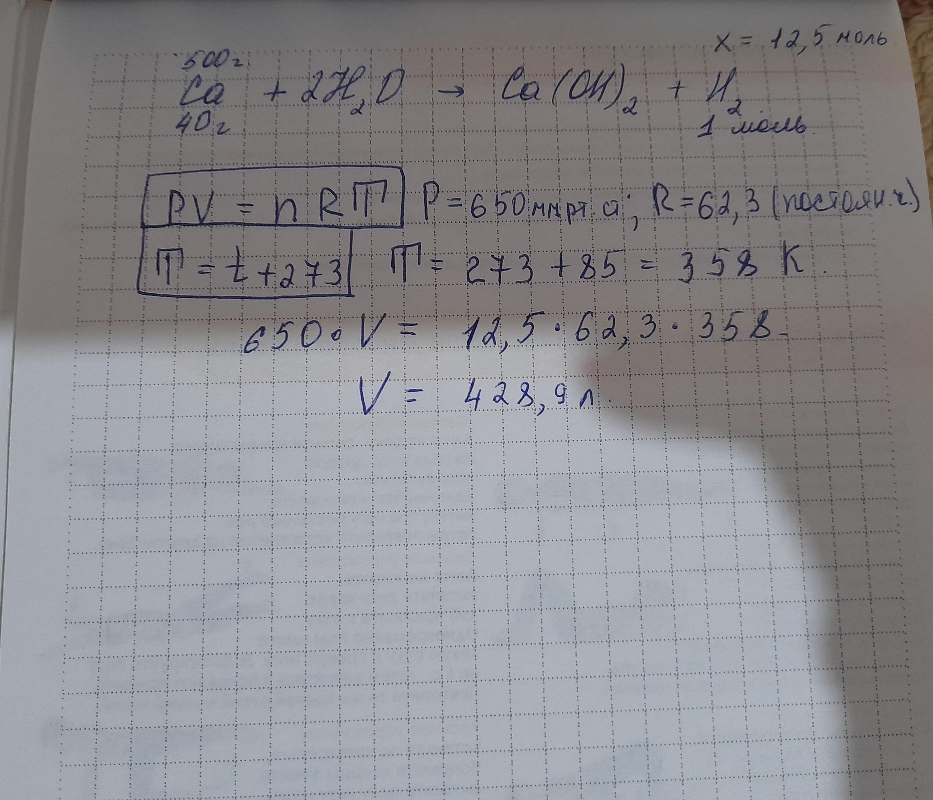 Рассчитать объем водорода, выделяющегося при взаимодействии 0,5 кг кальция с водой при температуре 85 0С и давлении 650 мм рт. ст.