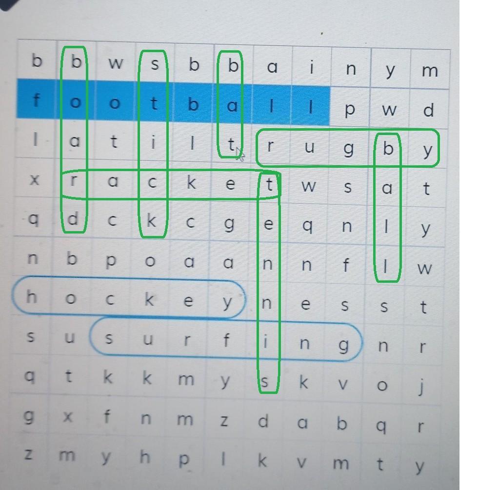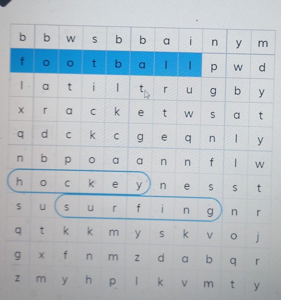 найдите все слова....типо глагооы surfing hocjey football а не sub sus и тд