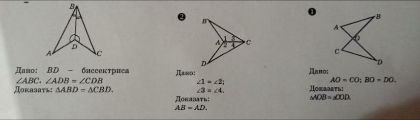 1. BD- общ, уг АВD = уг DBC, уг ADB = уг CDB, треугольники равны по стороне и 2 углам.