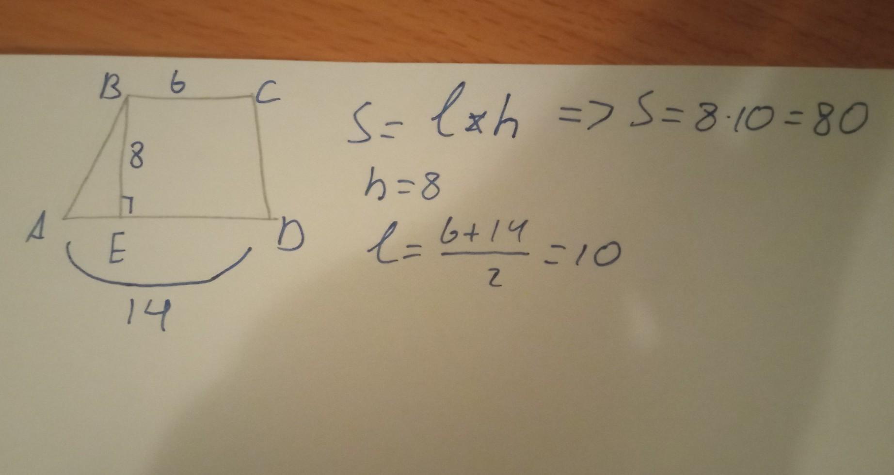Дана трапеция ABCD с основаниями BC= 6 см и AD= 14 см. Высота BE проведена к основанию AD и равна 8 см.