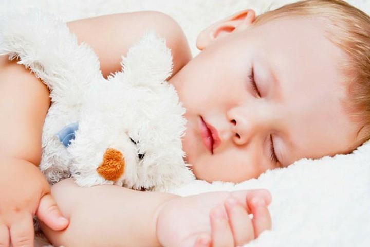 Кішкентай бала ұйықтап жатыр. Ойыншығын құшақтап жатыр.