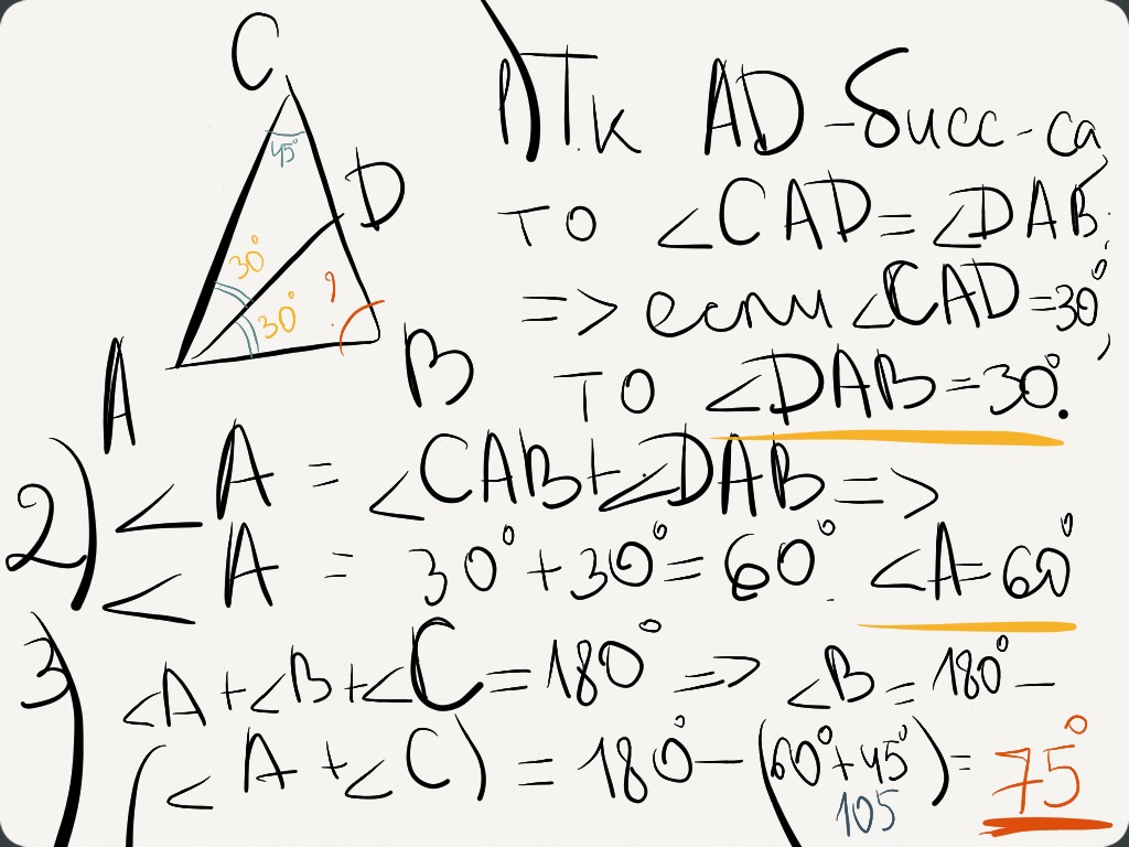 В треугольнике АВС угол С равен 45 градусов; AD-биссектриса,угол САD равен 30 градусов.Найдите угол B.