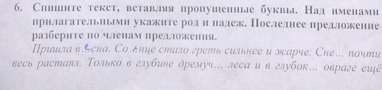 Весна, солнце стало греть сильнее (Ср.р, И), Снег, дремучего (М.р, П.п), глубоком (М.р,П.п)