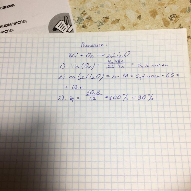 Кислород объемом 4,48 л (н.у.) реагирует с литием, при этом образовался оксид лития (Li2O) массой 10,8 г. Определите выход продукта реакции