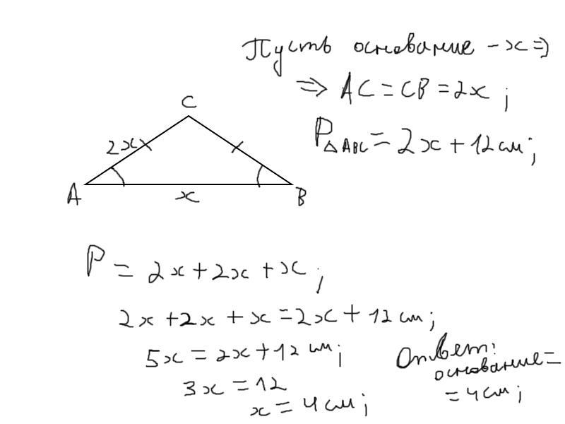 Боковая сторона равнобедренного треугольника в два раза больше основания и на 12 см меньше периметра треугольника найдите основание треугольника