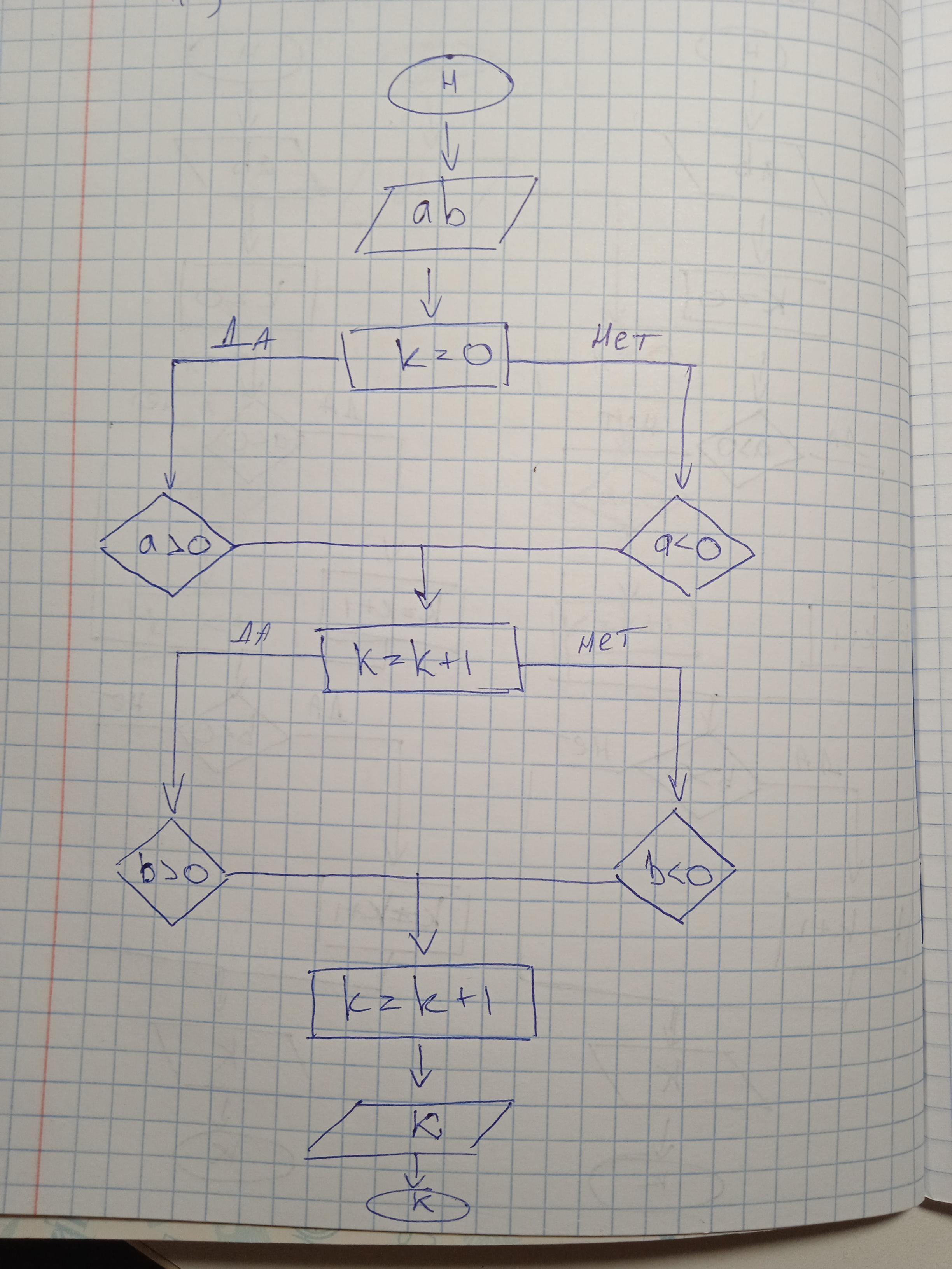 Построить блок-схему для подсчета количества положительных и отрицательных чисел в