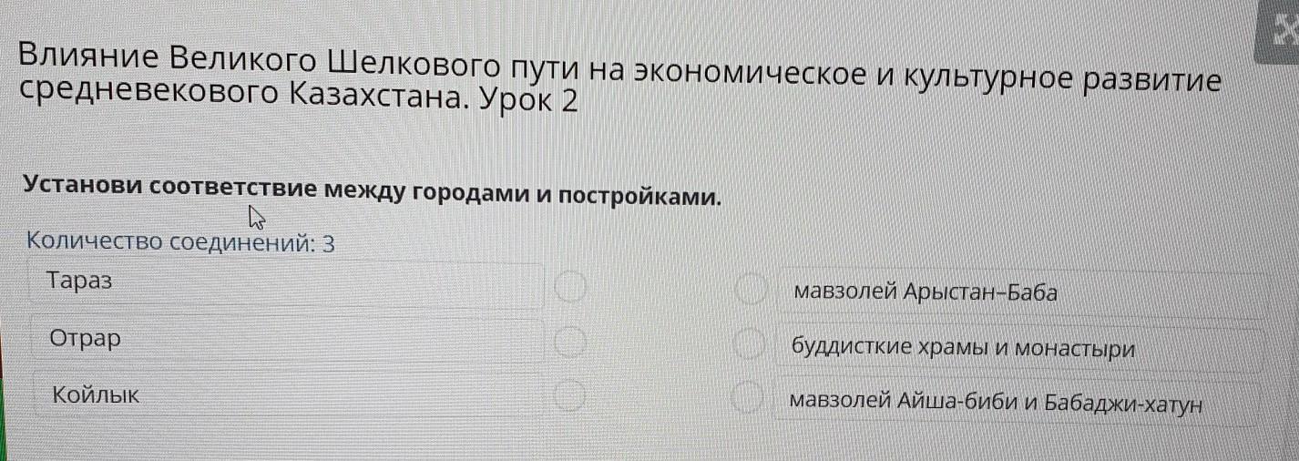 Установи соответствие между городами и постройками. Количество соединений: 3 Тараз мавзолей Арыстан-Баба Отрар ООО буддисткие храмы и монастыри Койлық мавзолей Айша-биби и Бабаджи-хатун