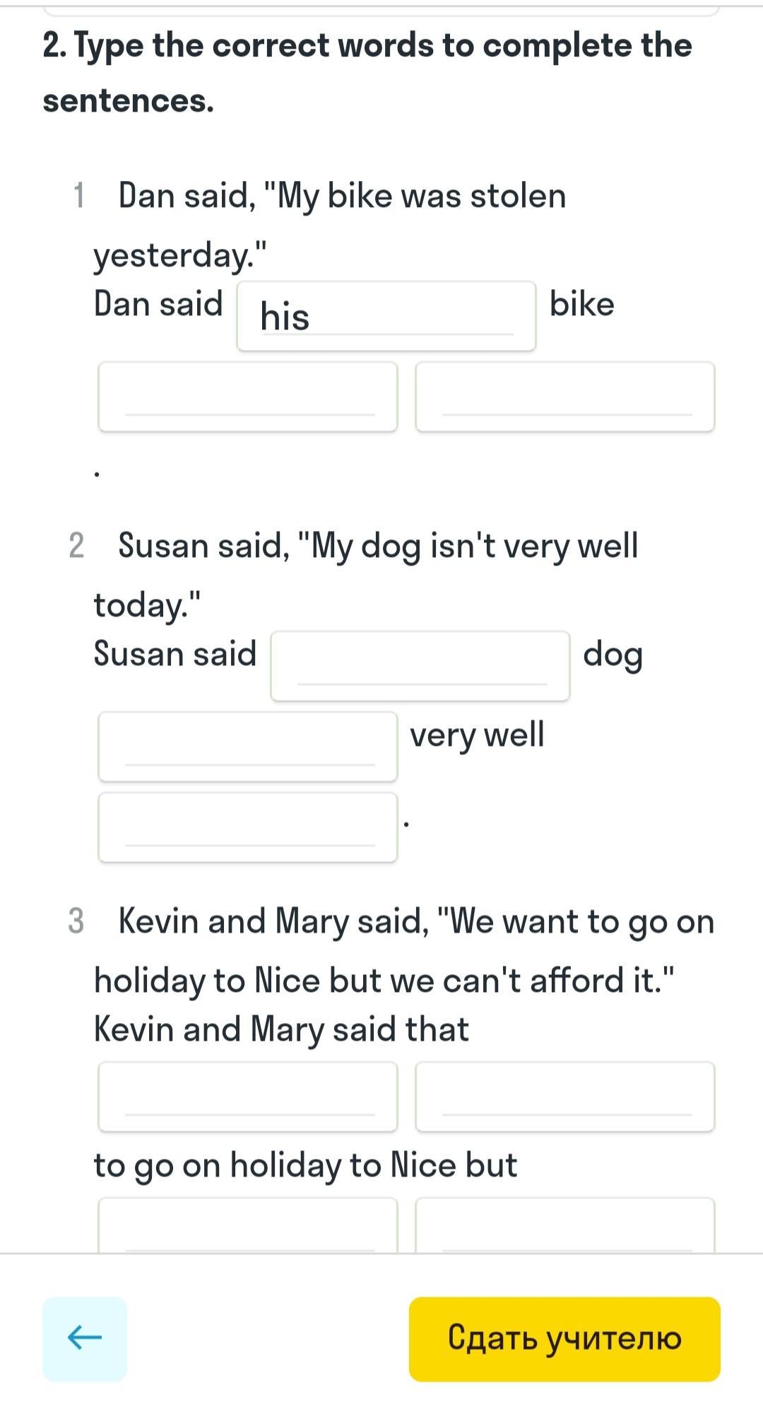 Susan said that her dog wasn't very well that day.3. K and M said that they wanted to go on holiday...............but they couldn't---------