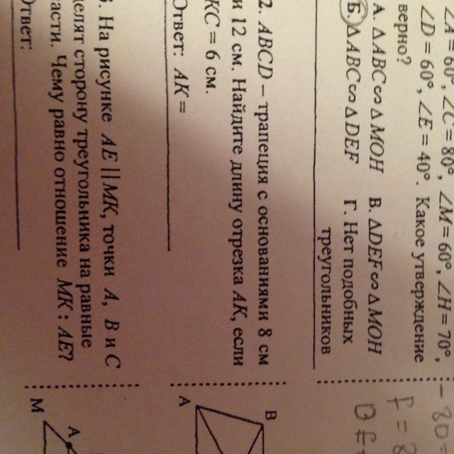 Как решить 2 задачу?ABCD-трапеция с основаниями 8 см и 12 см найдите длину АК если кс=6 см