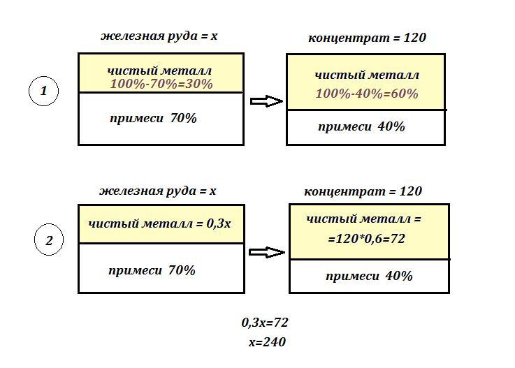 100 баллов, Срочно. В процессе обогащения железной руды, которая содержит 70% примесей, получают концентрат, который содержит 40% примесей. Сколько тонн железной руды потребуется для получения 120 тонн концентрата?
