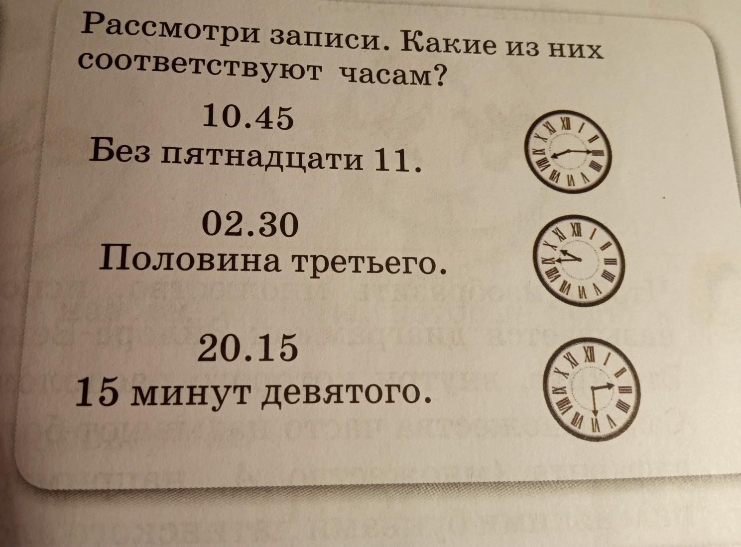 Рассмотри записи. Какие из них соответствуют часам? 10.45 Без пятнадцати 11. ки НА АА XII 7 02.30 Половина третьего. ИА XI 1 20.15 15 минут девятого.