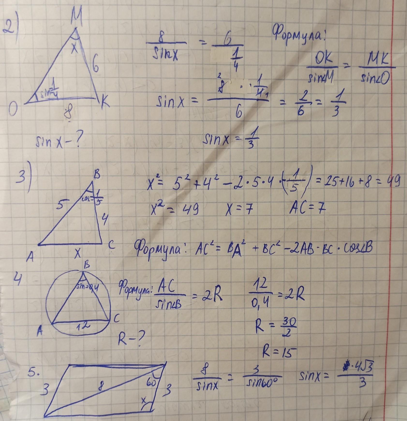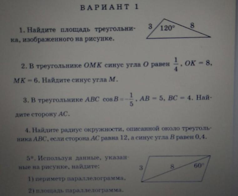 1) S=(3×8×sin120)/2=6√3 (по формуле S=(1/2)×a×b×sin угла между сторонами)