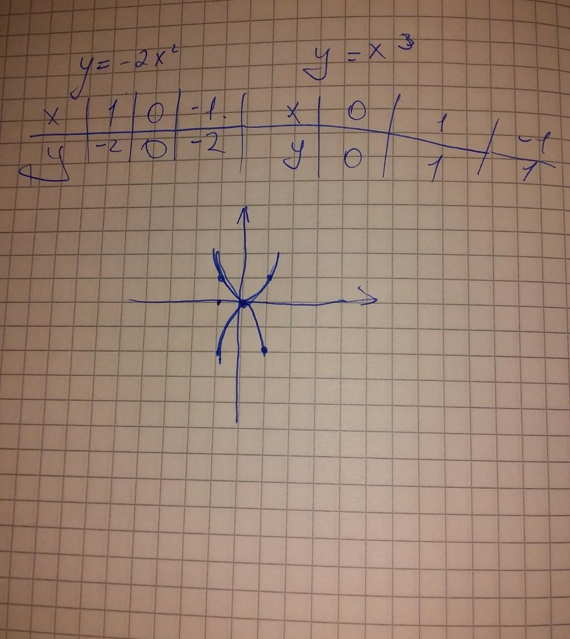 Построить в одной координатной плоскости графики функций y = -2x^2 и y = x^3 и записать координаты точек их пересечения