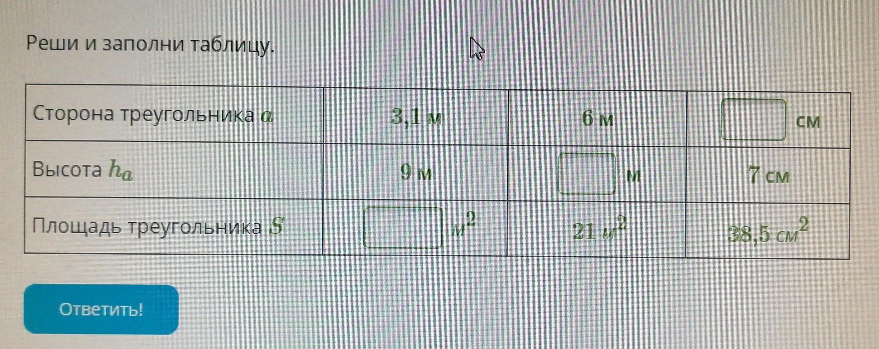 Площадь треугольника S: 27,9м² 21м² 38,5см²