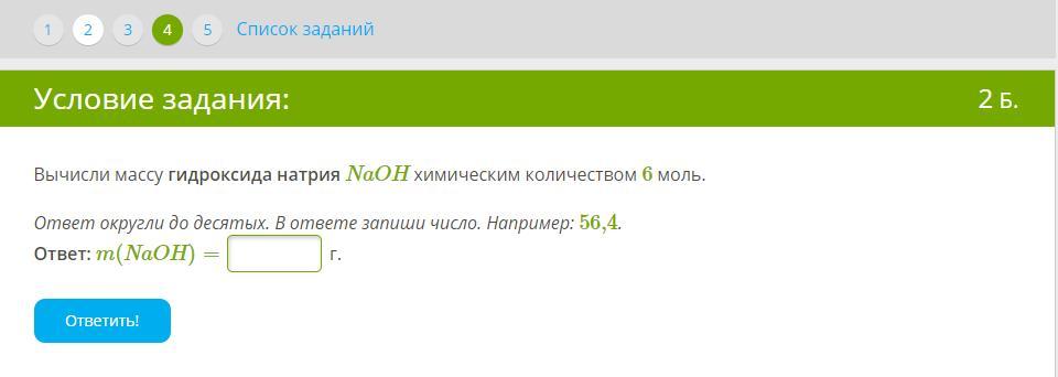 Вычисли массу гидроксида натрия NaOH химическим количеством 6 моль.
