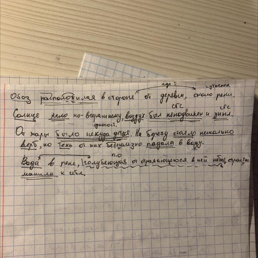 Обоз ра...пол....жился в стороне от деревн... около реки. Солнце жгло по-вчерашнему воздух был неподвижен и уныл. От жары было некуда деться. На берегу стояло несколько верб но тень от них бе...полезно(3) падала в воду. Вода в реке голубеющая от отражающегося(2) в ней неба страс...но(3) манила к себе.