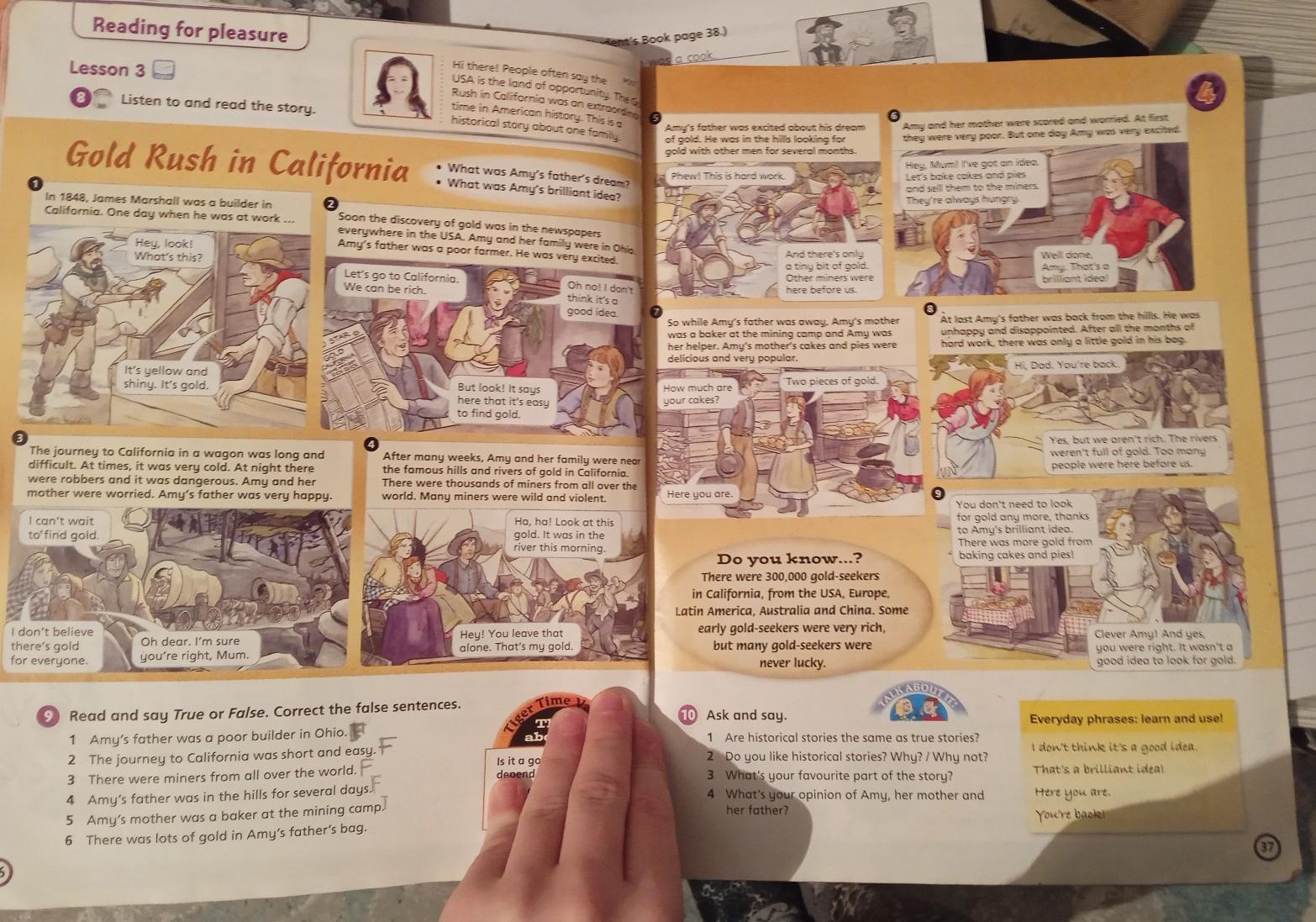 p Reading for Lesson 3 7 Read the story and write the answers (See Student's Book page 36.) Ask and say. Picture 1: Who was James Marshall? James Marshall Picture 2: What was Amy's father? Picture 3: Who was very happy? Picture where were Amy and her family? Pictures Where was Amy's father for several months Picture 6. What was Amy's idea? Picture 7: What was Amy's mother? Picture 8: Why was Amy's father disappointed? Picture 9: What was there more gold from? Order and write the sentences. Помогите пожалуйста