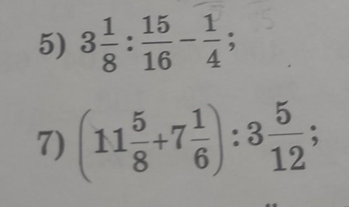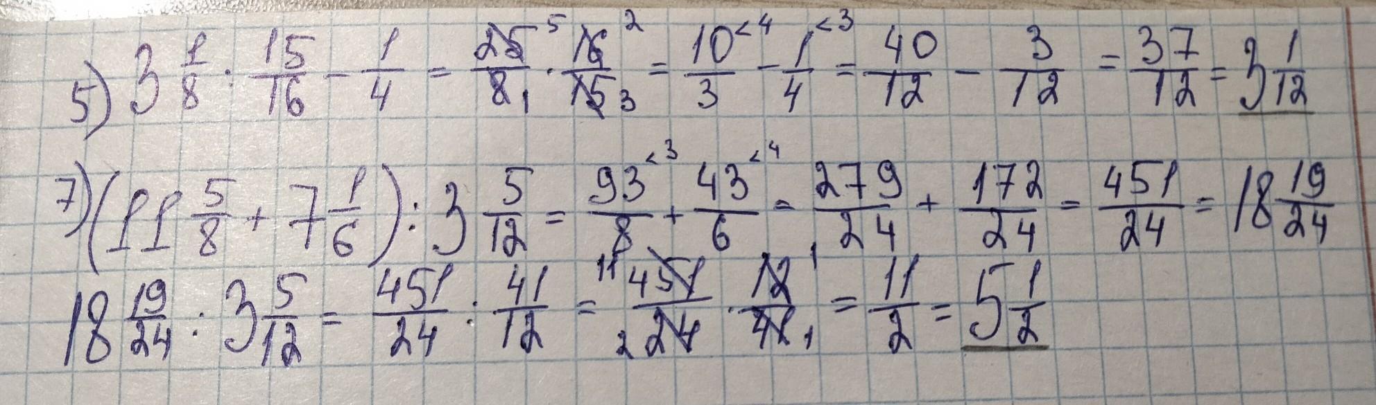 7) ( 11 5/8 + 7 1/6) : 3 5/12 = ( 11 15/24 + 7 4/24) : 3 10/24 = 18 19/24 : 3 10/24 =