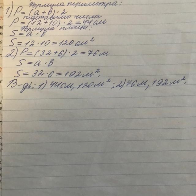 604. Знайдіть периметр і площу прямокутника, якщо його сторони дорівнюють: 1) 12 см і 10 см; 2) 32 м і 6 м.