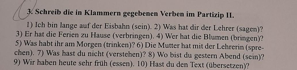 3. Schreib die in Klammern gegebenen Verben im Partizip II. 1) Ich bin lange auf der Eisbahn (sein). 2) Was hat dir der Lehrer (sagen)? 3) Er hat die Ferien zu Hause (verbringen). 4) Wer hat die Blumen (bringen) 5) Was habt ihr am Morgen (trinken)? 6) Die Mutter hat mit der Lehrerin (spre- chen). 7) Was hast du nicht (verstehen)? 8) Wo bist du gestem Abend (sein)? 9) Wir haben heute sehr früh (essen). 10) Hast du den Text (übersetzen)? Σας,