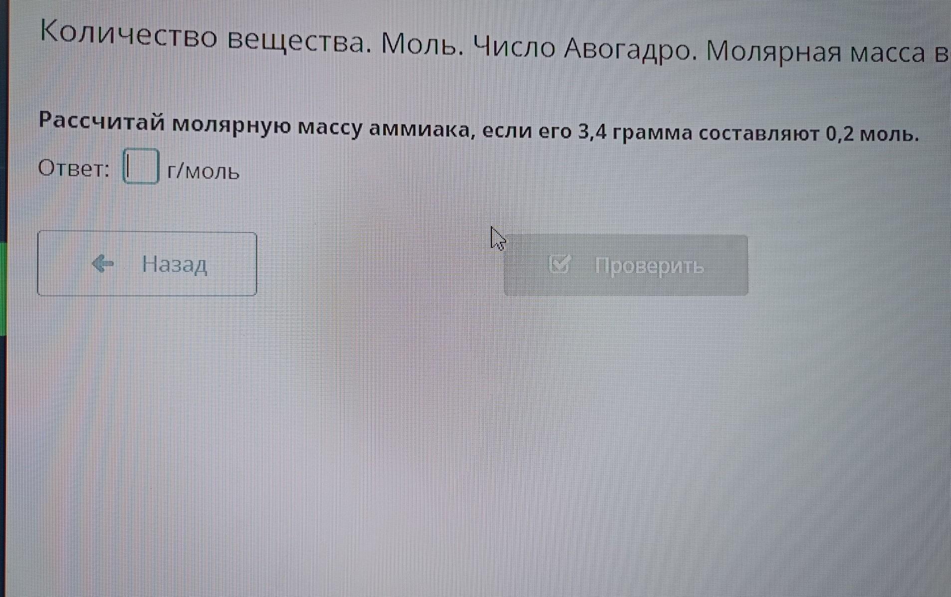 Найдём молярную массу аммиака, зная, что m = 3,4 г и n = 0,2 моль.
