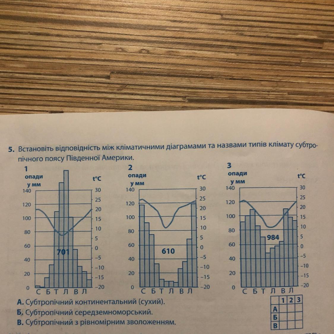 Встановіть відповідність між кліматичними діаграми та назвами типів клімату субтропічного поясу південної Америки