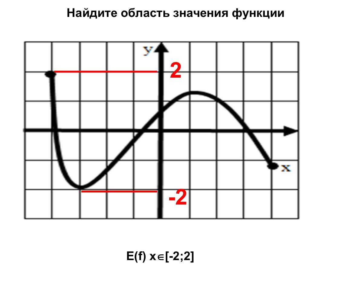 Когда речь идет об области ЗНАЧЕНИЙ функции мы сразу смотрим на ось У, ищем минимальное и максимальное значение. Например на любой прямой нет мин и макс значения, это значит, что для любой прямой E(y)=(-бесконечности; + бесконечности). Другой пример на фото.