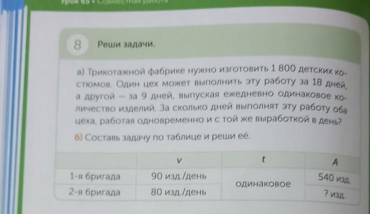 а) Трикотажной фабрике нужно изготовить 1 800 детских костюмов. Один цех может выполнить эту работу за 18 дней, а другой-за 9 дней выпуская ежедневно одинаковое количество изделий. За сколько дней выполнят эту работу оба цеха, работая одновременно и с той же выработкой в день?