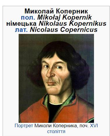 Микола́й Копе́рник (пол. Mikołaj Kopernik, німецька Nikolaus Kopernikus, лат. Nicolaus Copernicus Torinensis або Thorunensis або Torunensis, ім'я при народженні — Nikolas Koppernigk; 19 лютого 1473, Торунь, нині Польща — 24 травня 1543, Фромборк, нині Польща) — польський астроном і математик, фізик, правник, дипломат, економіст, канонік та лікар. Автор геліоцентричної теорії побудови Сонячної системи.