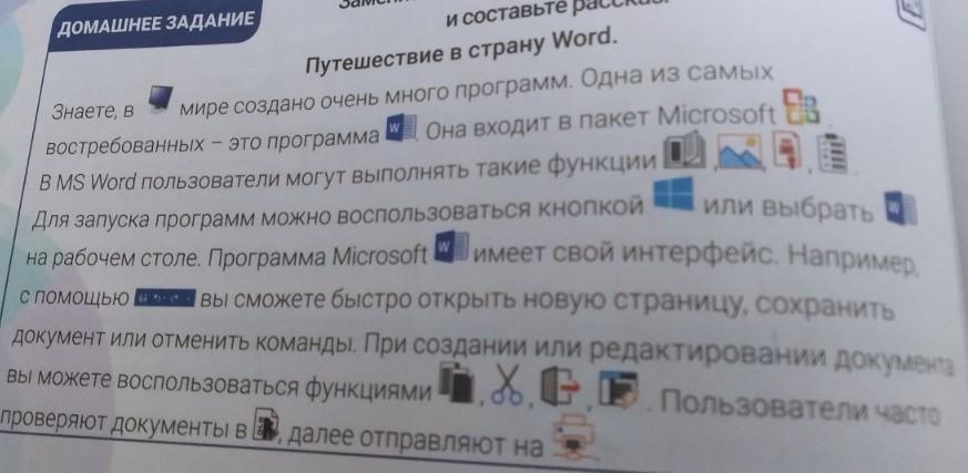 ЕР W W ДОМАШНЕЕ ЗАДАНИЕ Замените картинки Подходящими словами и составьте рассказ. Путешествие в страну Word. Знаете, в мире создано очень много программ. Одна из самых Г. востребованных – это программа Она входит в пакет Microsoft E3 В MS Word пользователи могут выполнять такие функции Для запуска программ можно воспользоваться кнопкой или выбрать на рабочем столе Программа Microsoft имеет свой интерфейс. Например, с помощью ве вы сможете быстро открыть новую страницу, сохранить документ или отменить команды. При создании или редактировании документа вы можете воспользоваться функциями і, X, ET. Пользователи часто проверяют документы в а, далее отправляют на