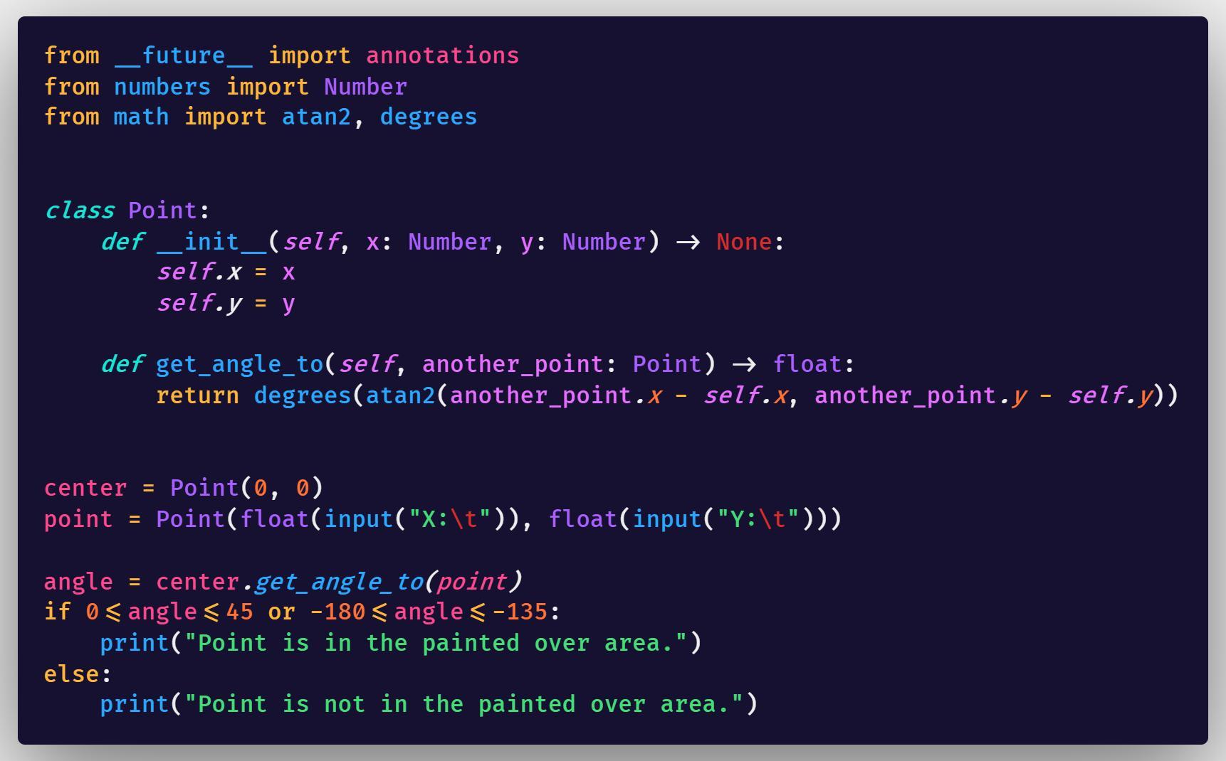 Определить, попадает ли точка с заданными координатами в за-крашенную на рисунке область. Реализовать решение задачи на языке программирования Python.