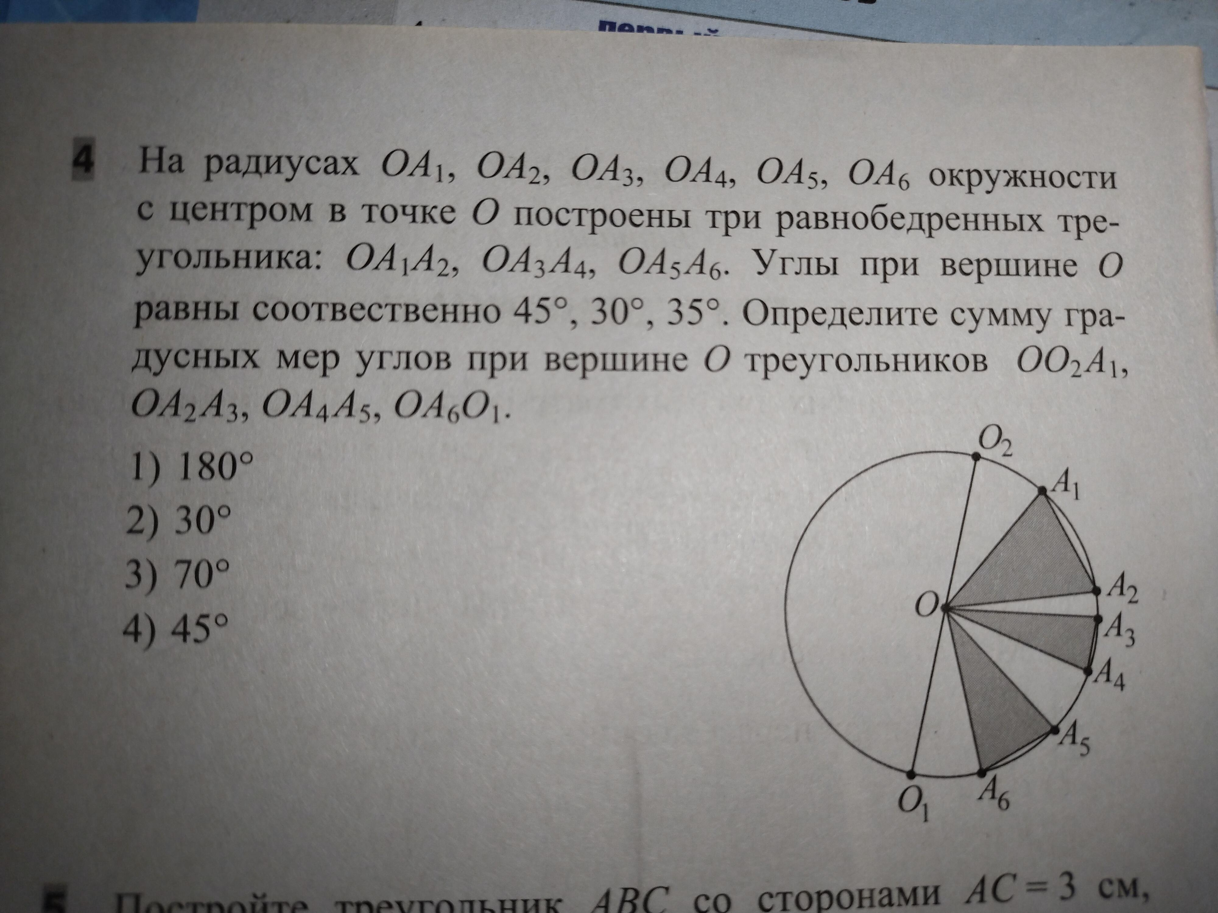 На радиусах ОА1, ОА2, ОА3, ОА4, ОА5, ОА6 окружности с центром точке О построены три равнобедренных треугольника: ОА1А2, ОА3А4, ОА5А6. Углы при вершине О равны соответственно 45°, 30°, 35°. Определите сумму градусных мер углов при вершине О треугольников ОО2А1, ОА2А3, ОА4А5, ОА6О1