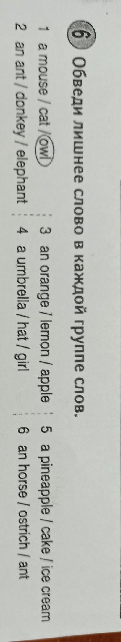 6 Обведи лишнее слово в каждой группе слов. 1 a mouse / cat lowl 2 an ant / donkey / elephant | 3 an orange / lemon / apple 5 a pineapple / cake / ice cream 4 а umbrella / hat / girl 6 an horse / ostrich / ant