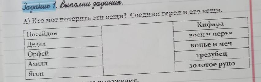 Кто мог потерять эти вещи? Соедини героя и его вещи. Посейдон Дедал Орфей Ахилл Ясон Кифара Воск и перья копье и меч трезубец золотое руно