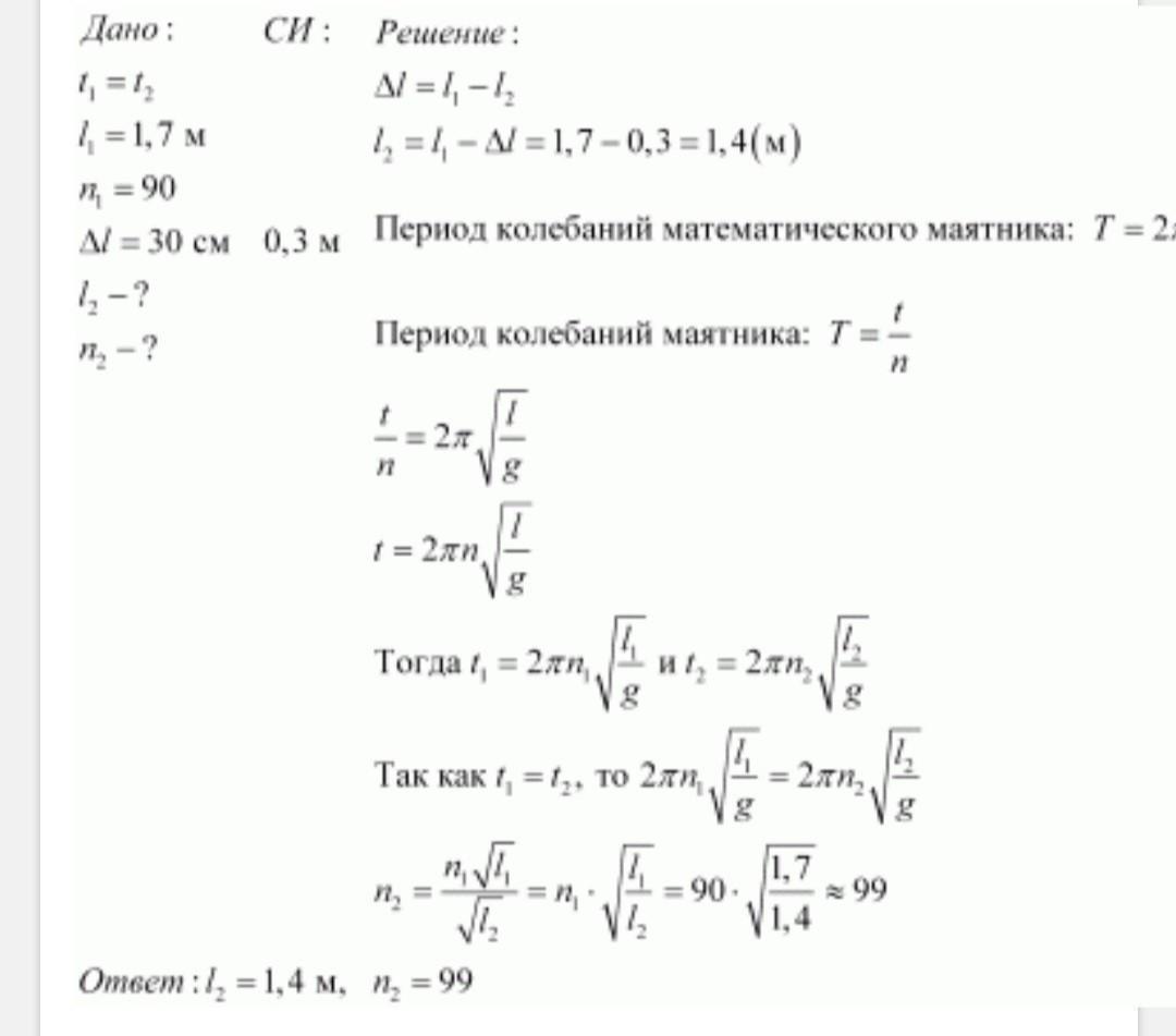 За одно и то же время маятники длинами 1м и l2 совершают соответственно 100 и