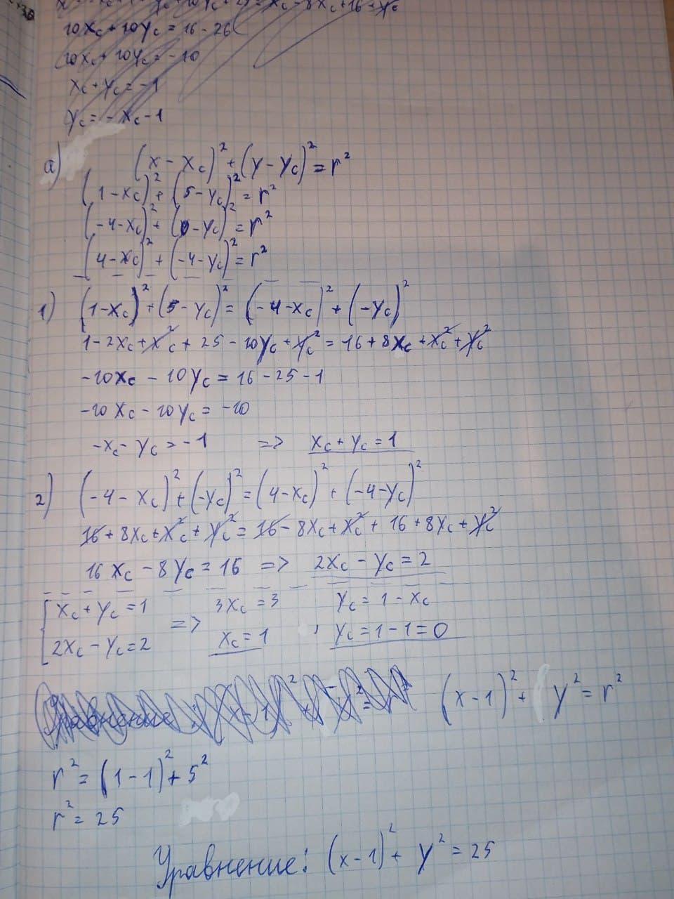 Находим 2 уравнения через два равенства, объединяем их в систему, находим нужные точки и составляем первичное уравнение окружности, находим радиус в квадрате окружности, поставив координаты одной из данных нам точек в уравнение и пишем полное уравнение окружности.