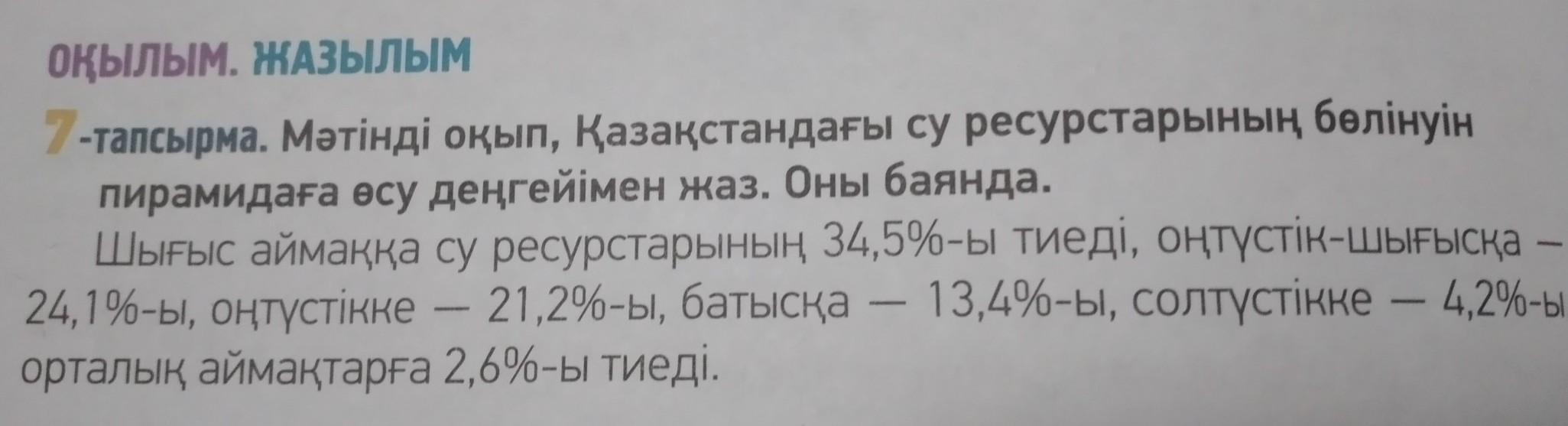 7-тапсырма. Мәтінді оқып, Қазақстандағы су ресурстарының бөлінуін пирамидаға өсу деңгейімен жаз. Оны баянда. Шығыс аймаққа су ресурстарының 34,5%-ы тиеді, оңтүстік-шығысқа 24, 1%-ы, оңтүстікке — 21,2%-ы, батысқа — 13,4%-ы, солтүстікке — 4,2%-ы, , , орталық аймақтарға 2,6%-ы тиеді.