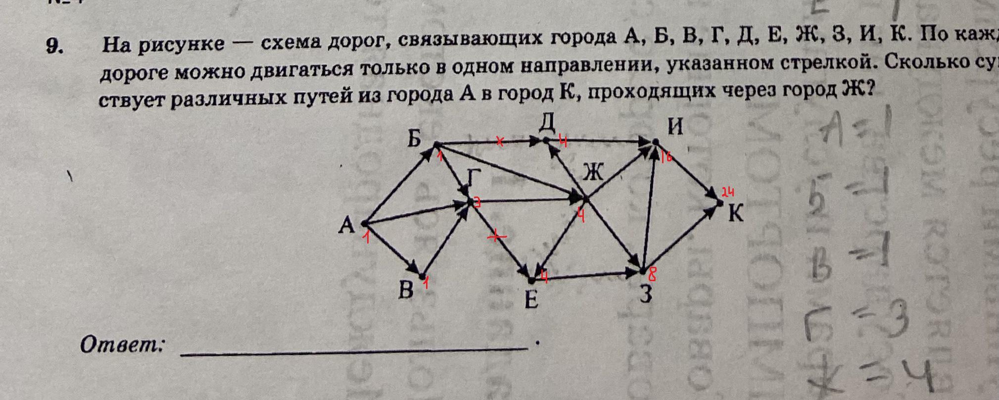 Помогите пожалуйста, не обращайте внимания на цифры, пыталась решить, если что смотрите на стрелки, а то похожие задачи есть, но там стрелки в другие стороны или не проходит через город Ж. Можно с решением? Какие дороги нужно убрать