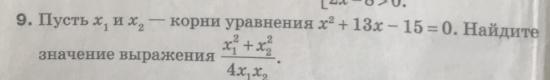 (x₁² + x₂²)/4x₁*x₂ = ((x₁ + x₂)² - 2x₁x₂)/4x₁x₂ = ((-13)² - 2*(-15))/4*(-15) = (169 + 30)/(--60) = - 199/60