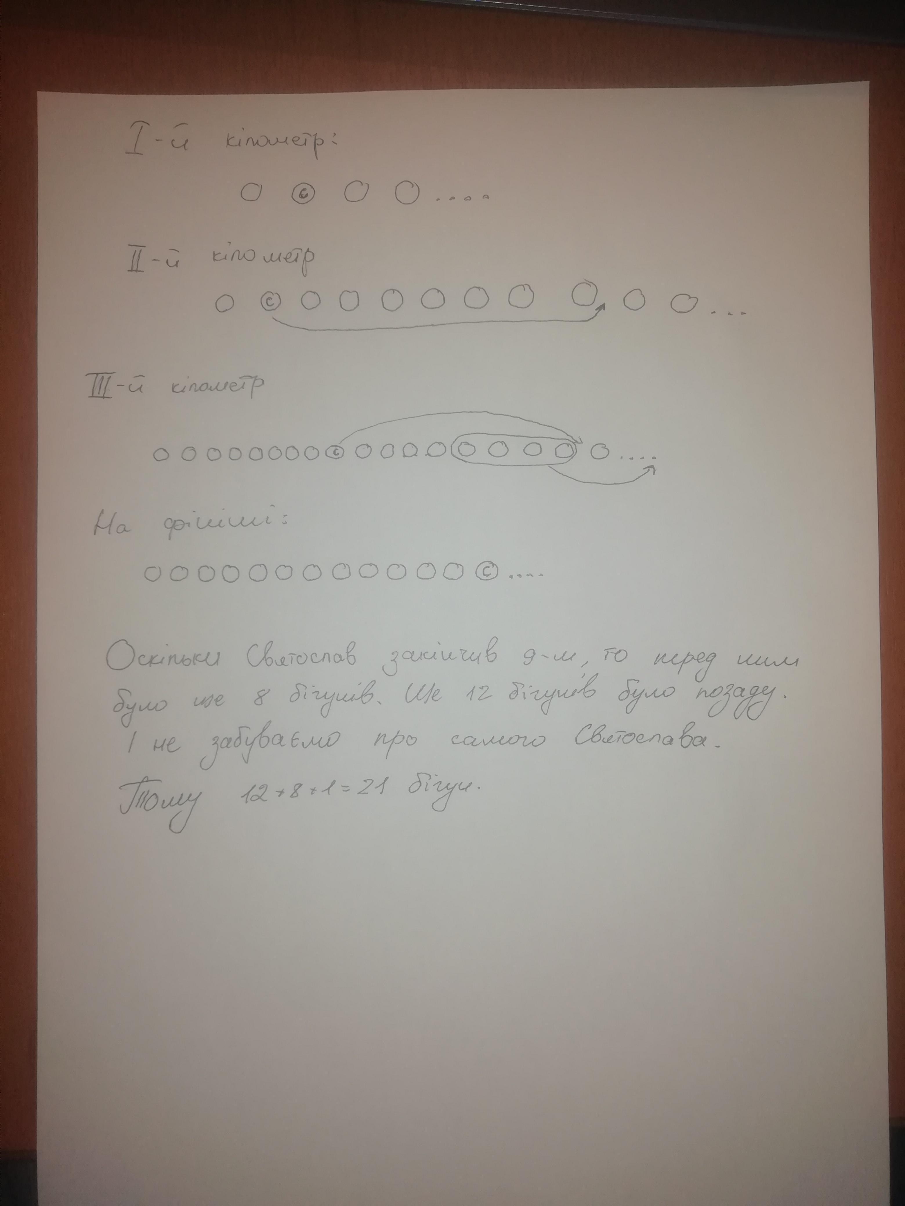 Після першого кілометра шкільного забігу Святослав був передостаннім. На наступному кілометрі йому вдалося обігнати сімох бігунів. На третьому, останньому кілометрі він обігнав вісім бігунів, але чотири інші бігуни випередили його. Він закінчив дев'ятим. Скільки було учасників забігу?