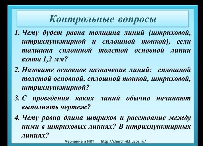 2) сплошная толстая основная - линия видимого контура, сплошная тонкая - линии размерные и выносные, штриховая - линия невидимого контура, штрихпунктирная - осевая и центровая