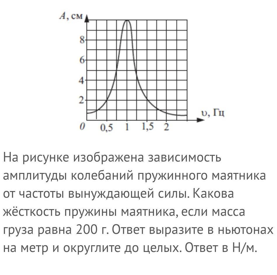 На рисунке изображена зависимость амплитуды колебаний пружинного маятника от частоты вынуждающей силы. Какова жёсткость пружины маятника, если масса груза равна 200 г. Ответ выразите в ньютонах на метр и округлите до целых. Ответ в Н/м.