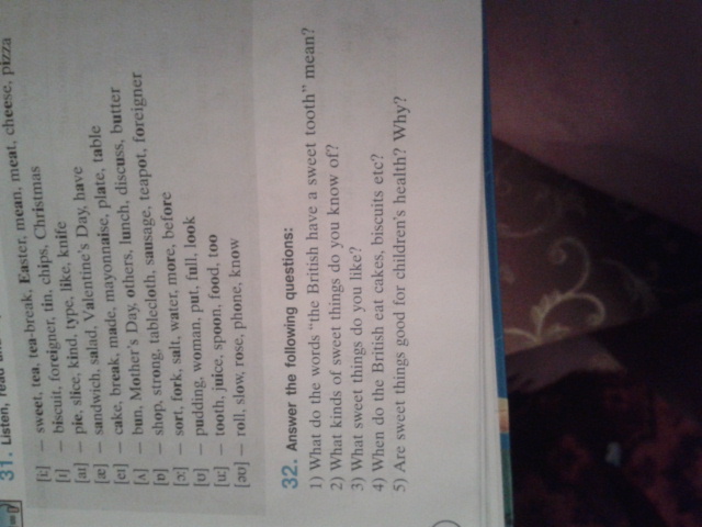 2. candies, cakes,pies, jam..ect. 3. ice-cream 4. l guess for lunch 5. it' s not good for childrens health because sweets have many calories but not vitamines for growing young body.