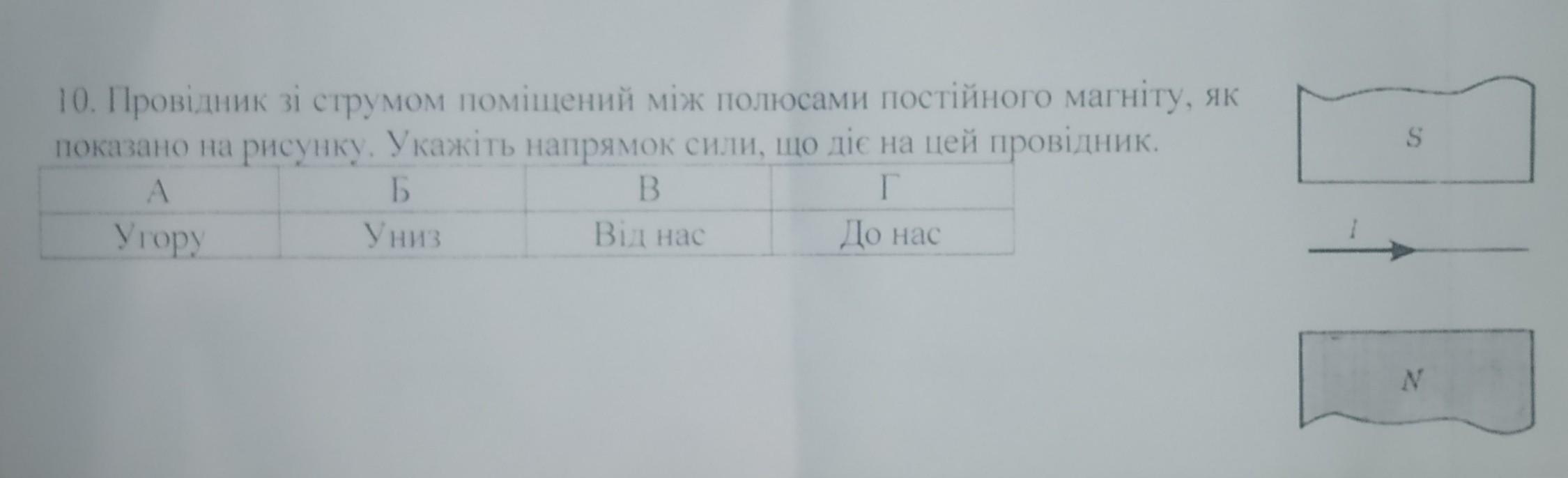 10. Провідник зі струмом поміщений між полюсами постійного магніту, як показано на рисунку. Укажіть напрямок сили, що діє на цей провідник.