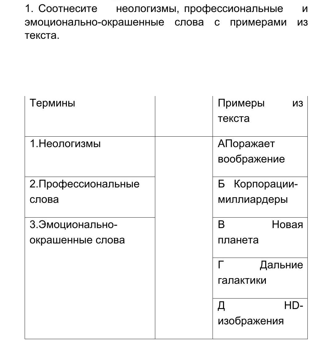 1. Соотнесите неологизмы, профессиональные и эмоционально-окрашенные слова с примерами из текста.