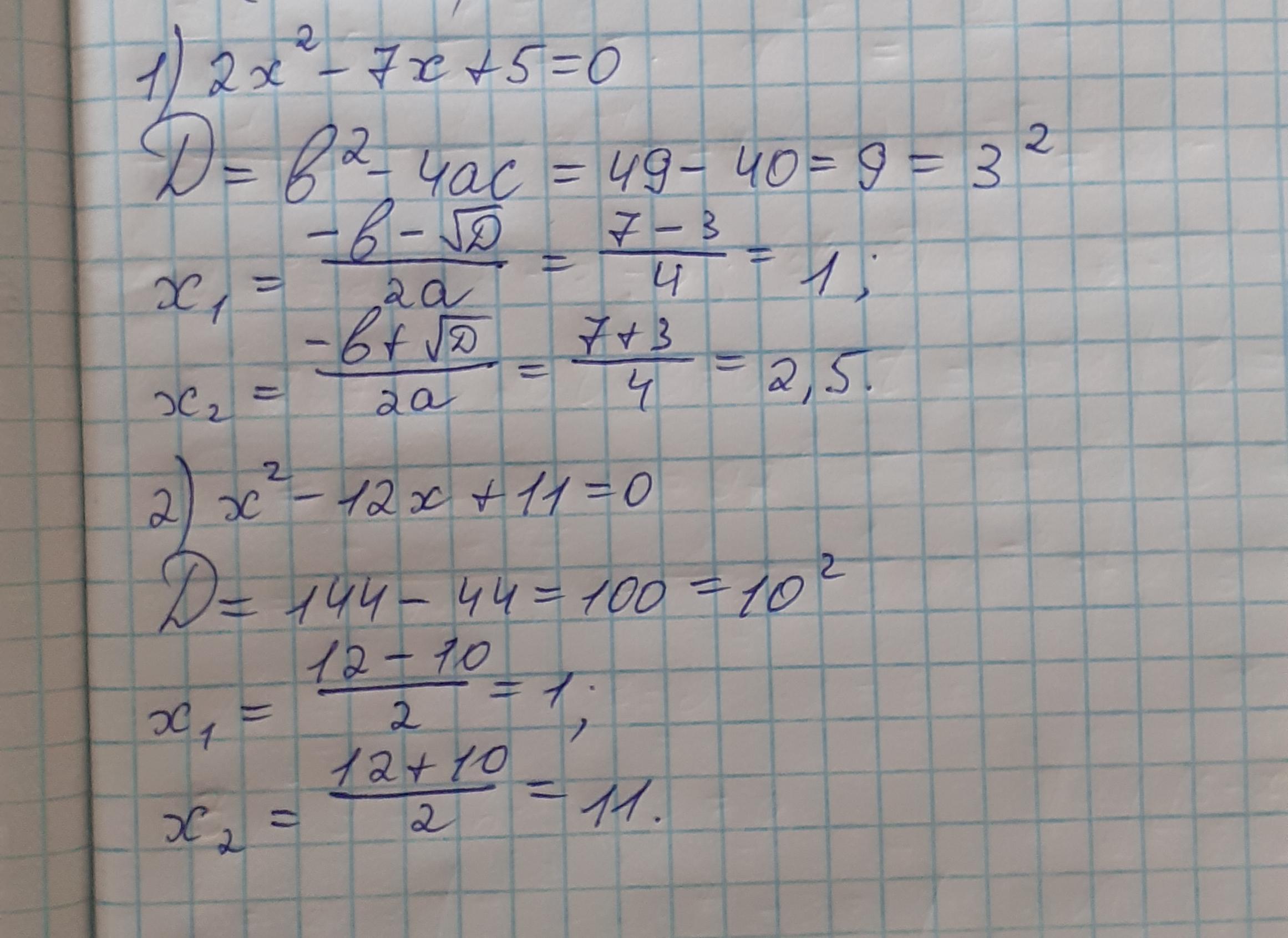Даны уравнения: 1) 2x²-7x+5=0 2) x²-12x+11=0 а) Определите, сколько корней имеет каждое уравнение б) Найди корни,если они существуют