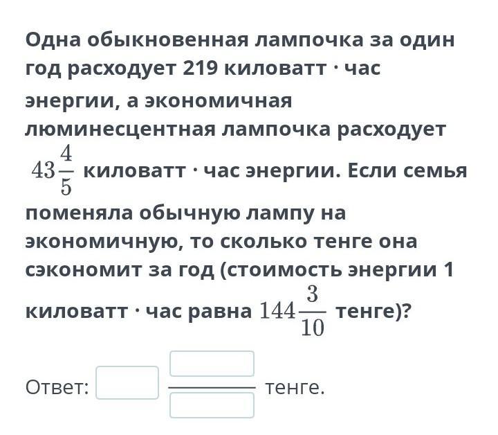 Одна обыкновенная лампочка за один год расходует 219 киловатт. час энергии, а экономичная люминесцентная лампочка расходует 43 4/ 5 киловатт.час энергии. Если семья поменяла обычную лампу на экономичную, то сколько тенге она сэкономит за год (стоимость энергии 1 киловатт час равна 144 3/10 тенге)?