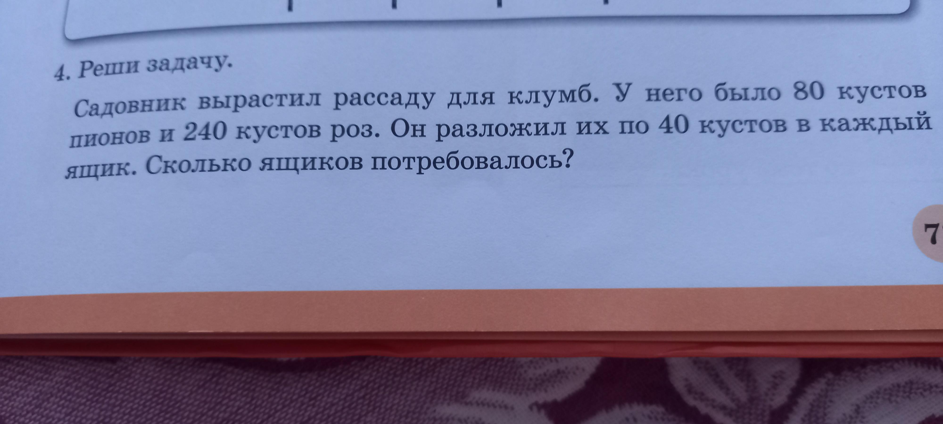 МАТЕМАТИКА 3 КЛАСС:Задание: Реши задачу.Садовник вырастил рассаду для клумбы. У него 80 кустов пионов и 240 кустов роз. Он разложил их по 40 кустов в каждый ящик. Сколько ящиков потребовалось?