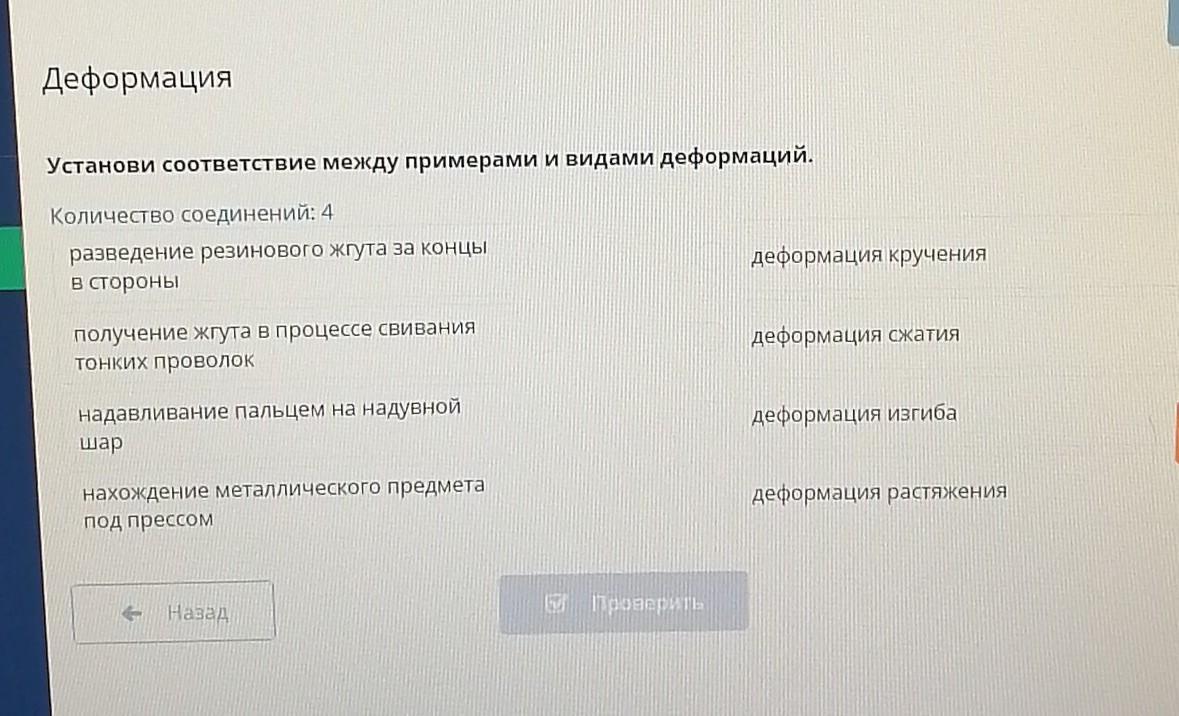 Разведение резинового жгута за концы в стороны —> деформация растяжения
