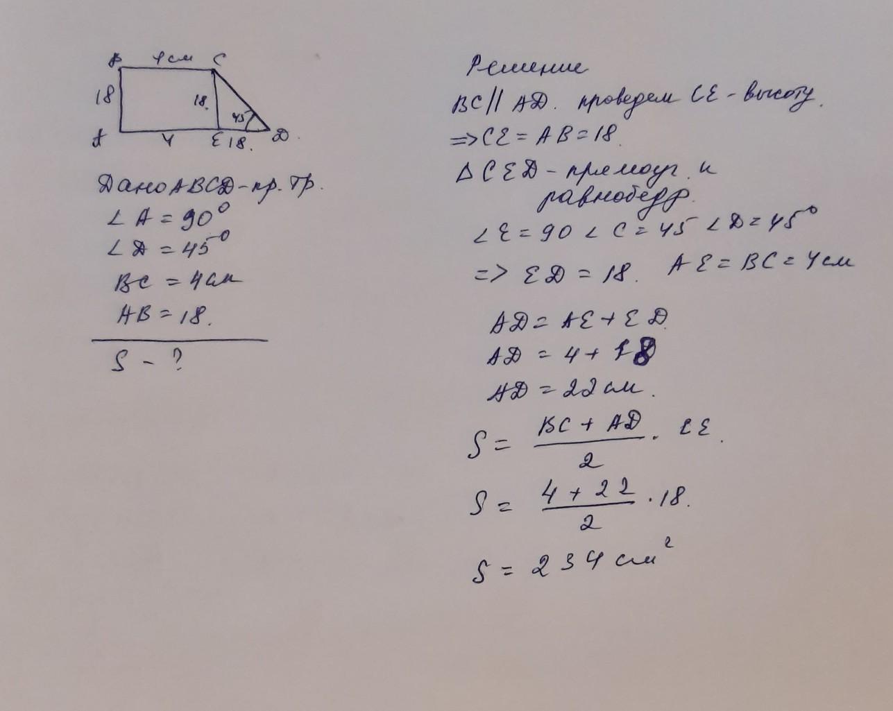 Дана прямоугольная трапеция, меньшее основание которой равно 4 см. Меньшая боковая сторона равна 18 см, а большая боковая сторона образует с основанием 45°. Найди площадь трапеции.